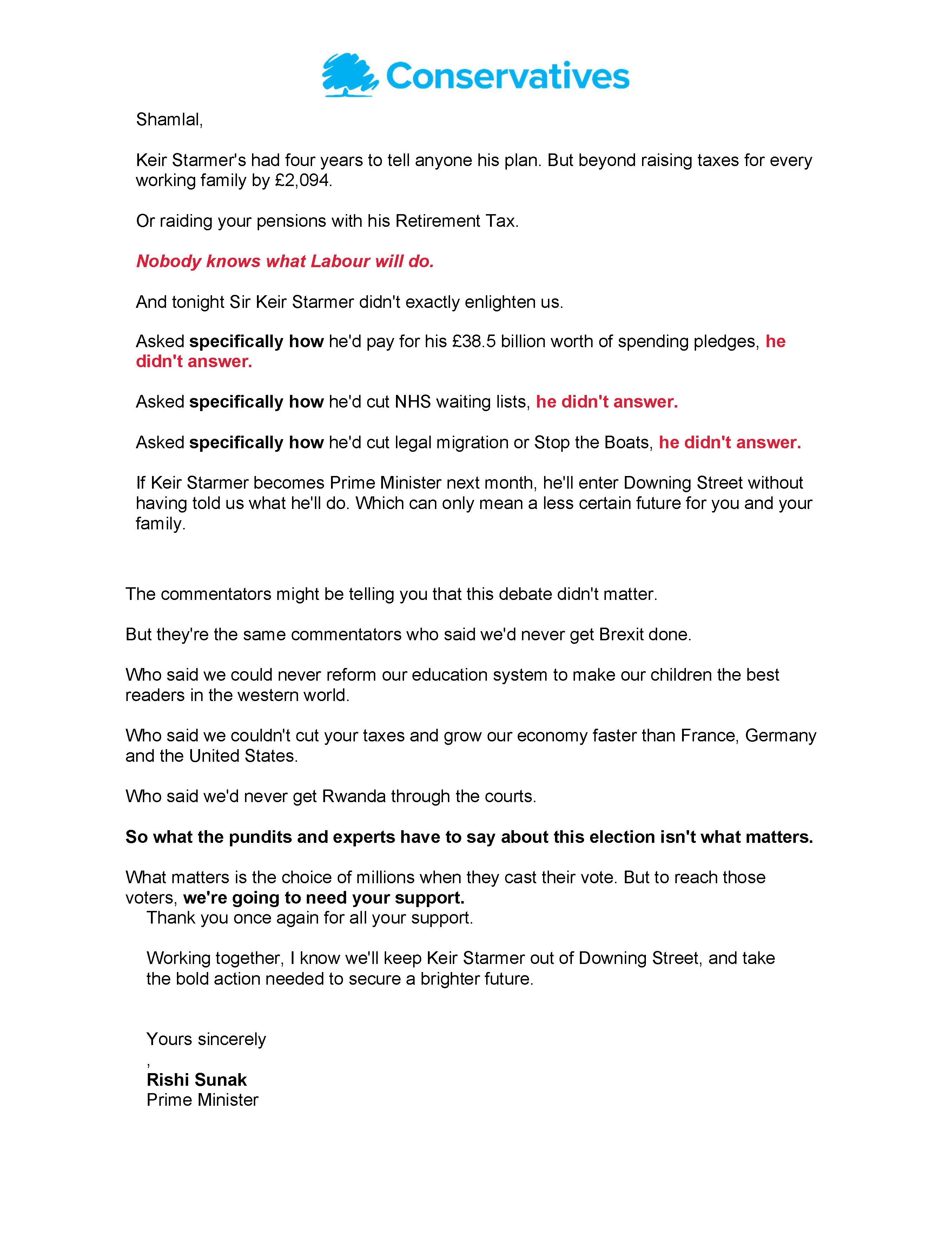 Sunak ensured the debate dominated on taxes. He said, “Mark my words, Labour will raise your taxes. It’s in their DNA. Your work, your car, your pension. You name it, Labour will tax it.”