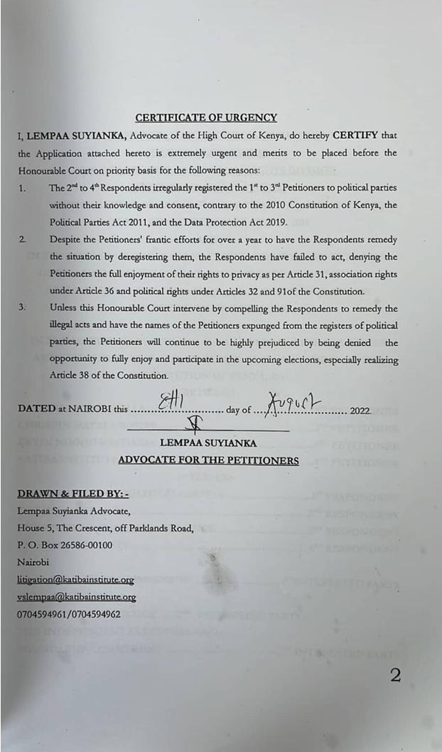 A close look at the court papers (Attached) however reveals a hurried attempt by the proxies of Azimio to derail the government of H.E. William Ruto, as the suit seeks the de-registration of the two political parties, despite the glaring dearth of evidence of any person illegally registered by the parties. Further, the suit accuses the parties of failing to register as data processors by 25th June 2021, yet the registration was due on 14th July 2022.