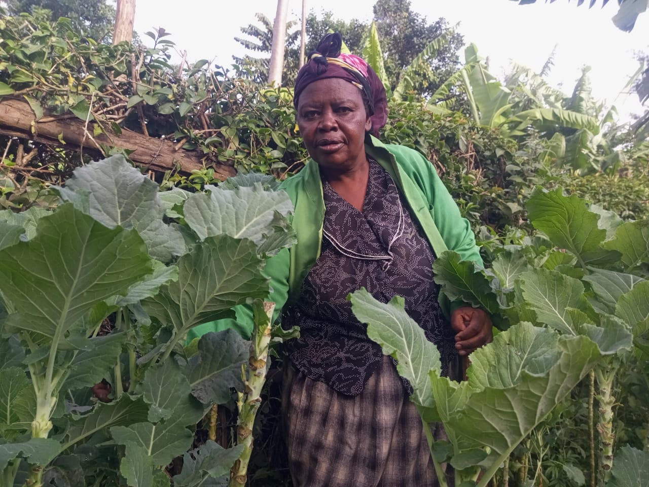 Nyanchama grows tomatoes, sukuma wiki, and onions on a small plot behind her home. The produce supports her children’s education and household needs.