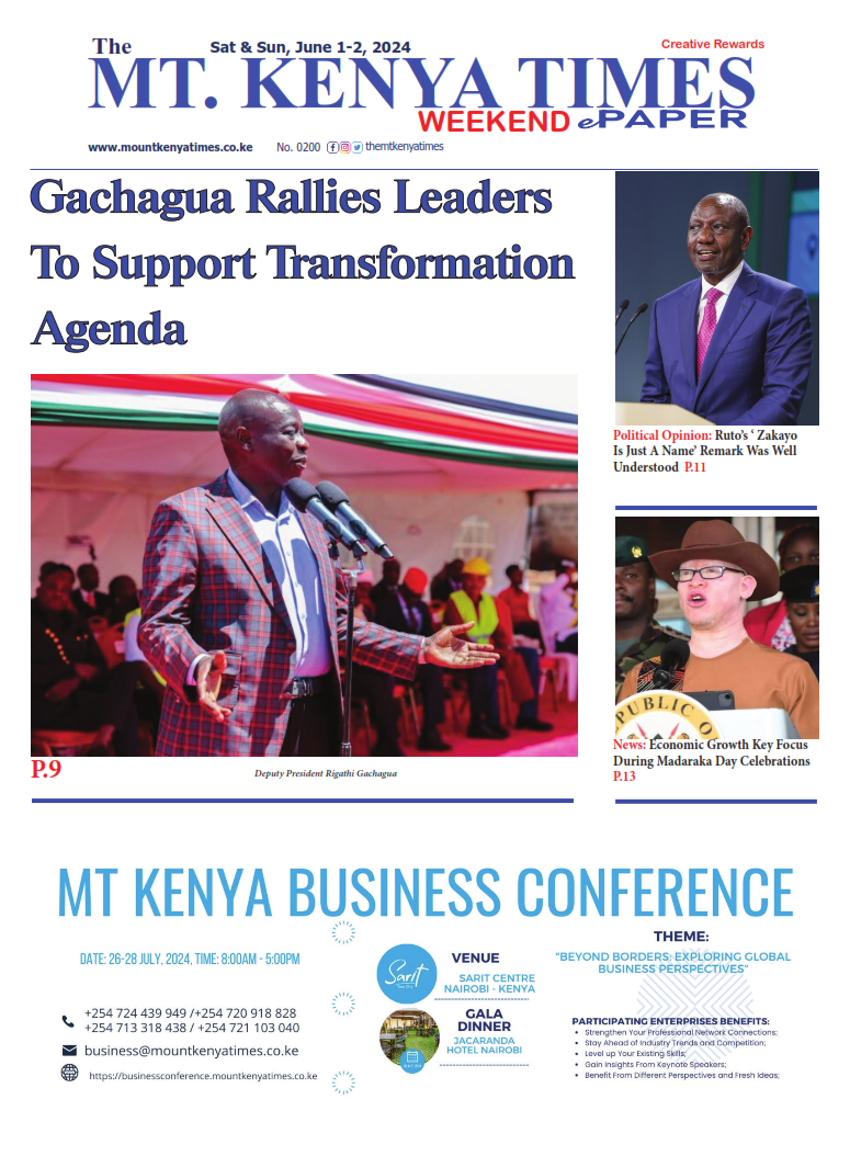 The Mount Kenya Times Click here to Read>>> Loading... Taking too long? Reload document | Open in new tab Click here to Download ePaper>>> Post navigation Mt Kenya Times ePAPER May 31, 2024 Diaspora Times Global June 1 – June 7, 2024