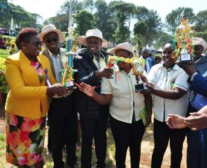 The KTDA team at the Meru ASK Show celebrated as they were awarded the trophies and certificates by area governor Kawira Mwangaza after the Trade Fair where they bagged five awards.