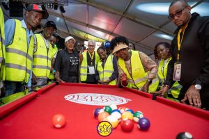 Uasin Gishu County Women Rep. Gladys Boss playing a Pool game at KICC last year. This was during the introduction of a new pool game known as “KREK It” where the winner walked away with KSh250,000. On the right is Base Yetu CEO Nick Mararo who introduced the new game. Looking on as players from Uasin Gishu and Dr Neil Horn from Chiromo Medical hospital.