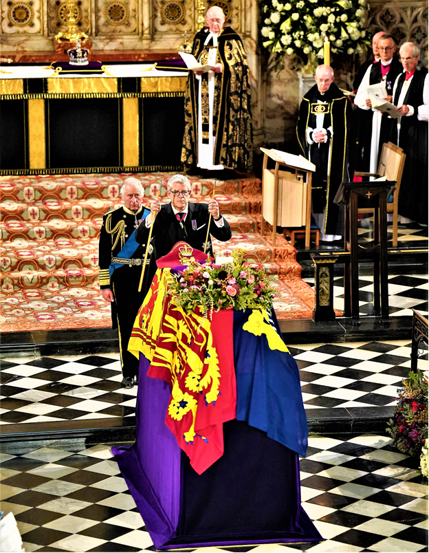 The atmosphere at the St George’s Chapel in Windsor was sombre as the 800 guests attended a committal service during which the crown, orb and the sceptre – potent symbols of the Queen’s power and governance were removed with the most incredible dignity from the coffin and placed on the altar.