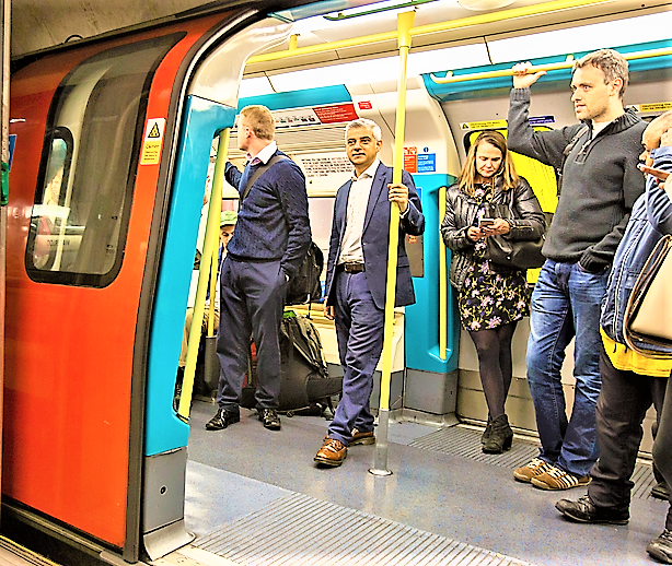 Mayor of London, Sadiq Khan,(centre holding pole) travelling on London Tube train. He is under pressure on ULEZ tax. Photo Transport for London