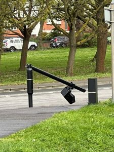 S for survellence One down… Protestors damaged this ULEZ camera left it lying on the ground.